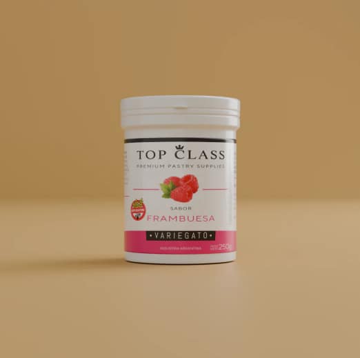 Para un efecto más visual, podés utilizar un glaseado espejo verde y luego colocar el variegato en el centro. O utilizar el Variegato de Frambuesa Top Class para un glaseado mas brilloso. Agrega frambuesas naturales.